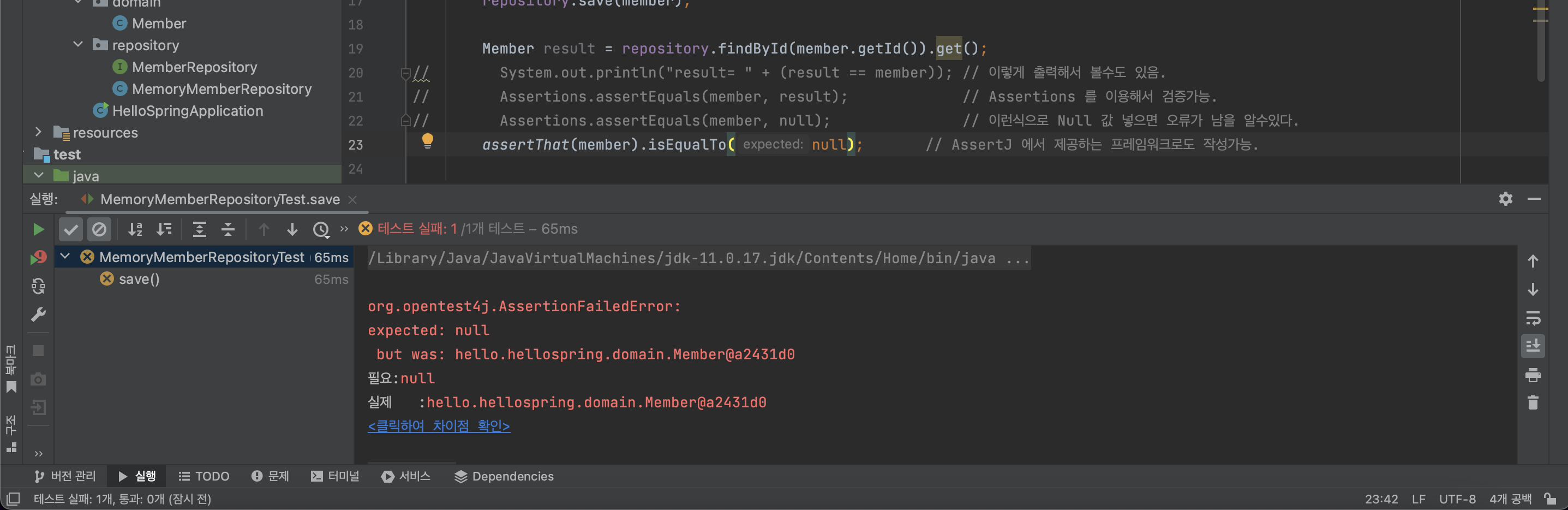// Assertions.assertEquals(member, null); // 이런식으로 Null 값 넣으면 오류가 남을 알수있다.